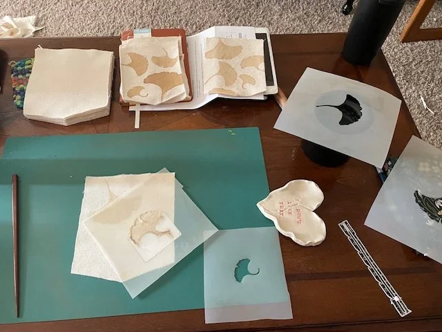 stencils made from tracing maple, oak, and gingko leaves collected in fall 2024. natural plant dyes (mostly acorns here) inlayed into unique, forest-floor inspired designs.